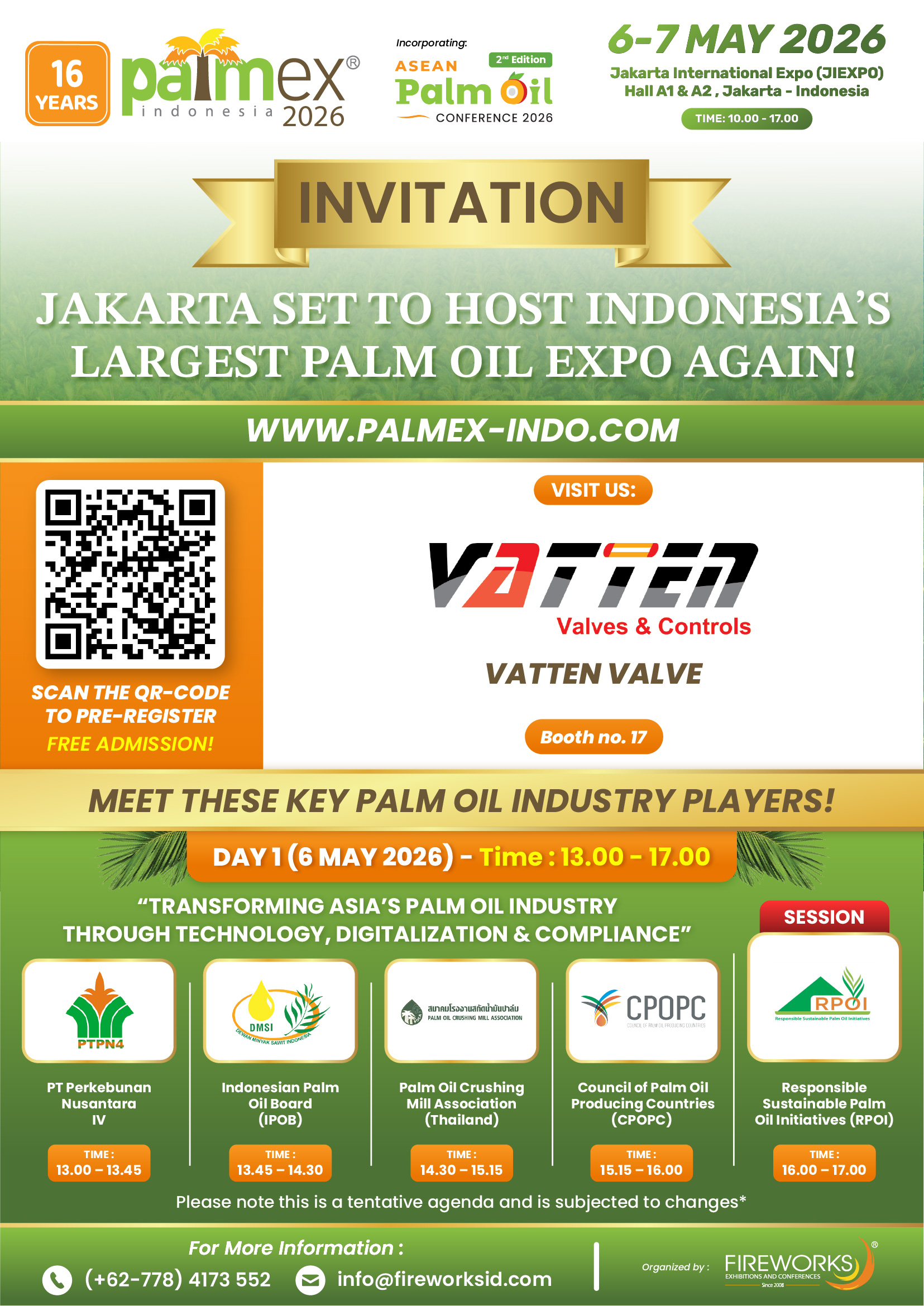 Diese Ausstellung wird von der Fireworks Exhibition Group (Singapur) organisiert und von offiziellen Institutionen wie dem Indonesian Palm Oil Council, dem Industrieministerium Indonesiens und der Asian Palm Oil Association stark unterstützt. Es handelt sich um eine der größten und einflussreichsten Fachmessen für die Palmölindustrie weltweit und auch um die erste große Veranstaltung für die Palmölindustrie in Indonesien im Jahr 2026.